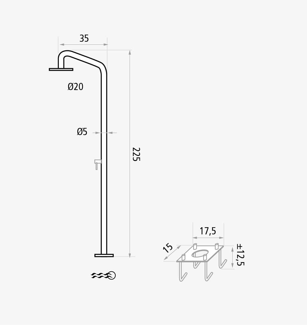 Colonna doccia realizzata in acciaio inox predisposta per installazione a pavimento in aree esterne, terrazzi, giardini, piscine pubbliche e private.