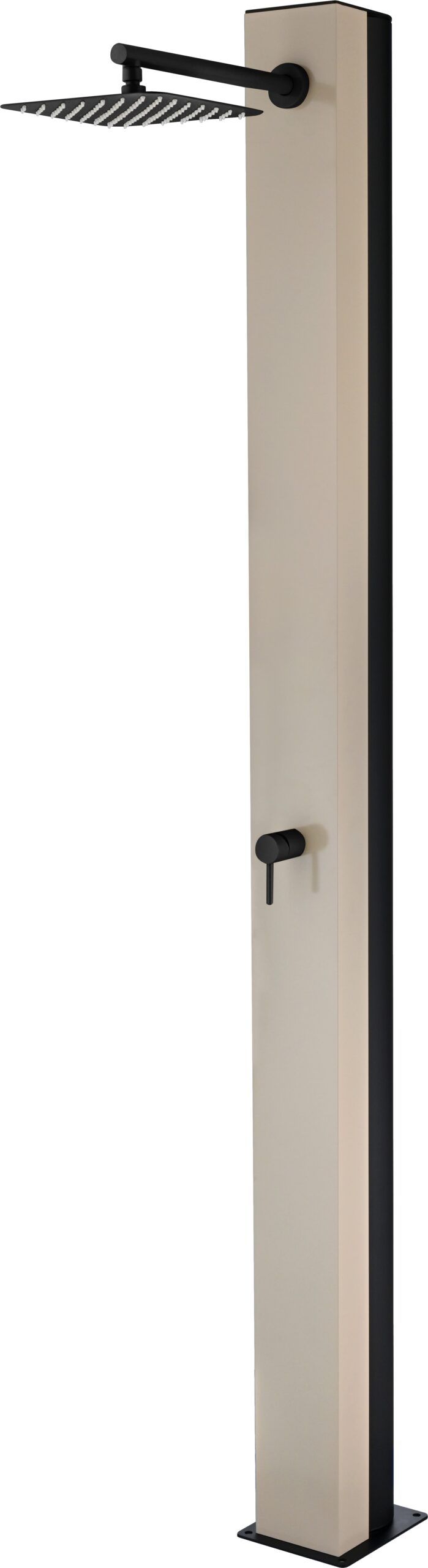 Ducha exterior Phoenix en acero S.316 con acabado moka y depósito de 38,8 L. Incorpora rociador cuadrado 25x25 cm y mando monomando para un uso sencillo en piscina y jardín. Altura 221,1 cm y construcción preparada para exterior con garantía de 10 años.
